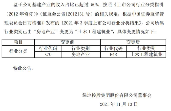 11月12日,綠地控股集團(tuán)股份有限公司發(fā)布公告稱,公司所屬行業(yè)類別已由“房地產(chǎn)業(yè)”變更為“土木工程建筑業(yè)”。