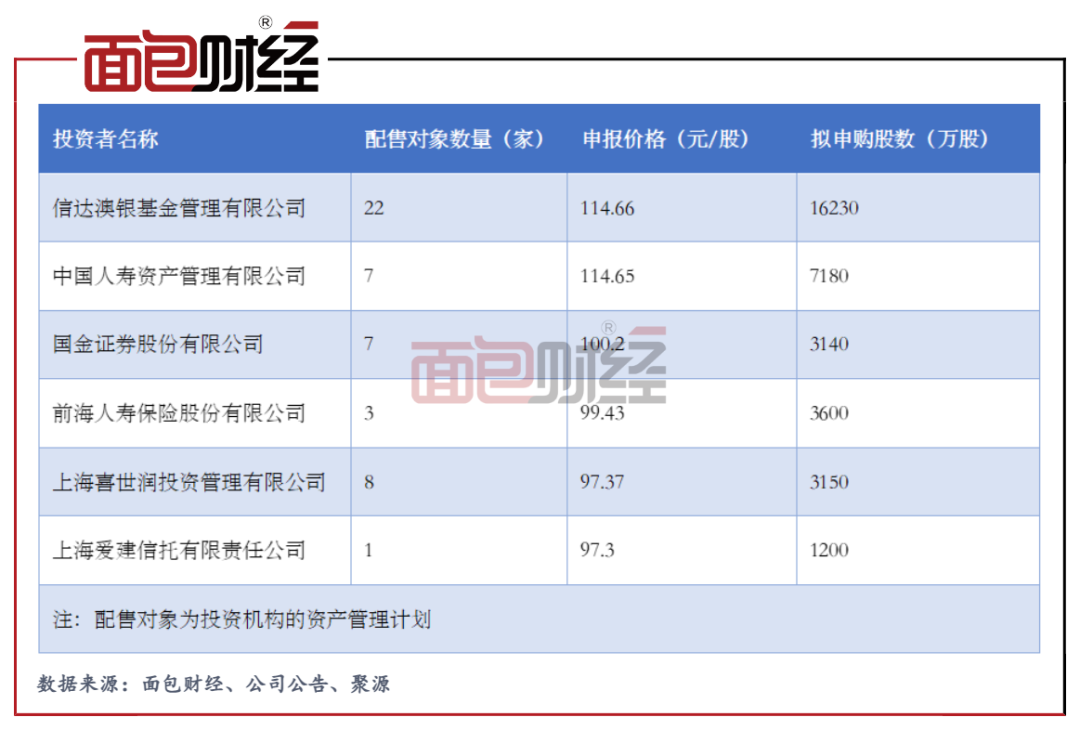 根據詢價明細,將所有投資者報價和擬申購股數加權平均得出的申報價格均值為89.23元/股,而所有投資者報價的中位值為90.79元/股。易方達和主承銷商中信證券分別報出的97.1元/股和94元/股明顯較高。