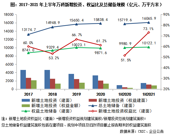 2021年上半年,萬科繼續量入為出、堅持理性投資,在優先保障投資質量的前提下補充項目資源。上半年新獲取項目95個,總規劃建筑面積1505.9萬平方米,權益規劃建筑面積1101.4萬平方米,投資規模較去年和2019年同期均有提升。項目總地價1126.3億元,樓面均價7480元/平方米,權益地價總額約886.5億元,新增投資金額92%位于一二線城市,且權益比較往年有明顯提升。