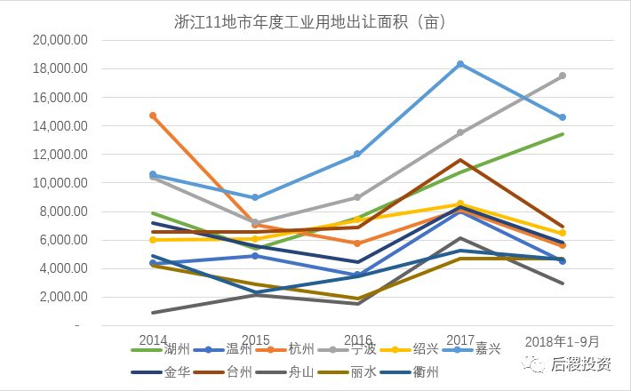 浙江一直是人多地少的省份,隨著2015年開始的資產(chǎn)價格上升,浙江各地政府紛紛開始實施“三改一拆”、“沿邊整治”、“騰籠換鳥”、“畝產(chǎn)改革”等運動,消減了大量非規(guī)范工業(yè)用地供應(yīng),提升了新增工業(yè)用地的供地門檻(投入及稅收層面),使得供需矛盾進(jìn)一步激化。