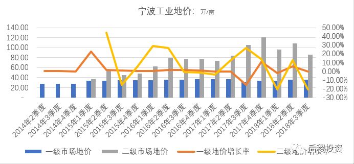 寧波近幾年的一級工業(yè)用地出讓面積基本上處于浙江前二的水平,大量供應(yīng),使得出讓價僅年增長7.66%。自2015年2季度開始,司法拍賣成交價顯著增長,并一直持續(xù)到2017年4季度,年均增長44.28%,截止2017年底,一級出讓價為二級成交價的36%左右。