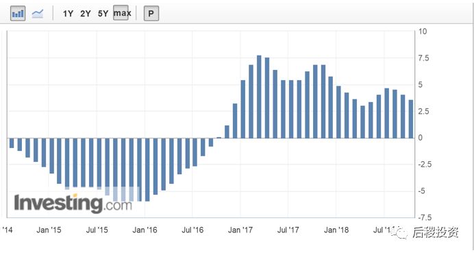 中國生產(chǎn)者物價指數(shù)(PPI) (同比),自2016年1月開始,從增長-5.9%一路上行至2017年3月的7.8%,并一直高位維持了一年左右。