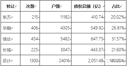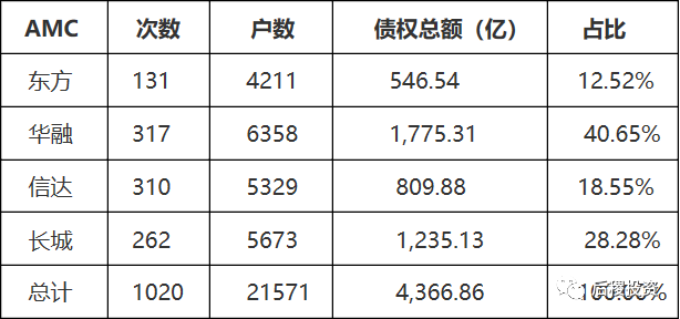 華融資產受讓債權總額、受讓次數、戶數在四大AMC中都排在首位,其中受讓債權總額占四大AMC的比例高達40.7%,而東方資產則在這三個指標均排在末尾。
