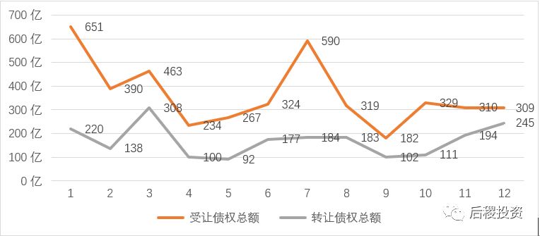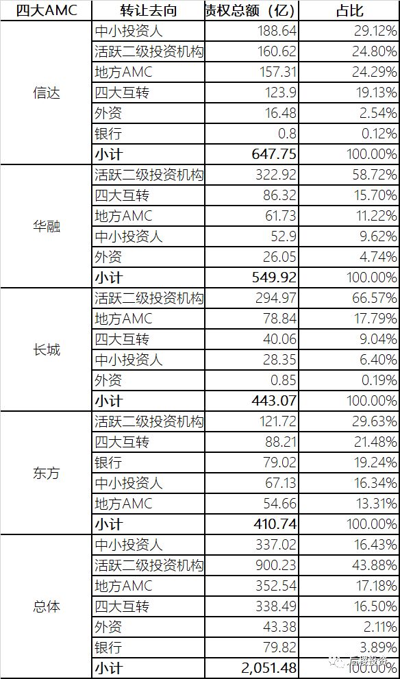 按2018年銀行出讓了4500億債權計,四大AMC從銀行共受讓了3385億,市場占比為75.2%。此外,四大間相互轉讓、銀行常用出表通道再次轉讓給四大的情況也不少見。
