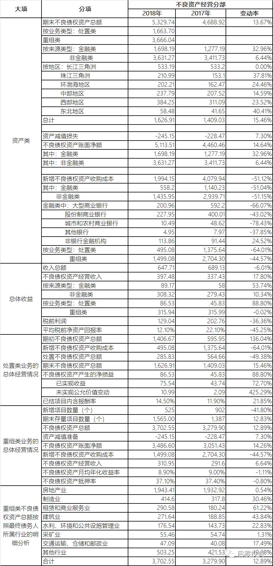 e. 重組類業務資產月均年化收益率由9%下調到8.9%,基本保持穩定;重組類資產中,房地產行業占比高達52.5%,雖然相較2017年的58.9%有較大幅度的下降,但占比仍然很重,以整個不良債權資產賬面凈額的5,113.51億為基數,房地產業務比重也達到了38%,在房地產行業持續調控的背景下,未來業績可能會進一步承壓。