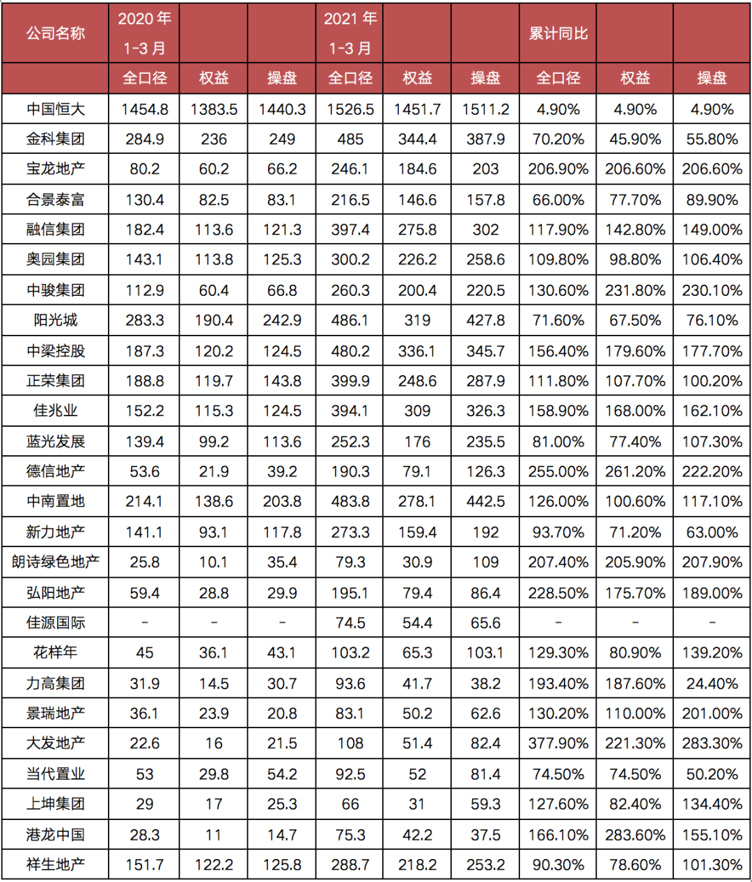 根據(jù)克而瑞證券統(tǒng)計(jì)數(shù)據(jù)顯示,2021年1-3月,26家“B”評級及樣本房企全口徑銷售額累計(jì)同比增速均值約為139.1%(除恒大),約有三分之二的房企實(shí)現(xiàn)銷售翻倍。此外,26家“B”評級及樣本房企權(quán)益銷售金額和操盤金額平均漲幅均超過了130%。究其原因,主要是去年同期受疫情沖擊,房地產(chǎn)供應(yīng)停擺而造成的銷售低基數(shù)影響。