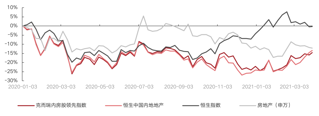 圖:克而瑞內(nèi)房股領(lǐng)先指數(shù)及恒生中國內(nèi)地地產(chǎn)指數(shù)走勢
