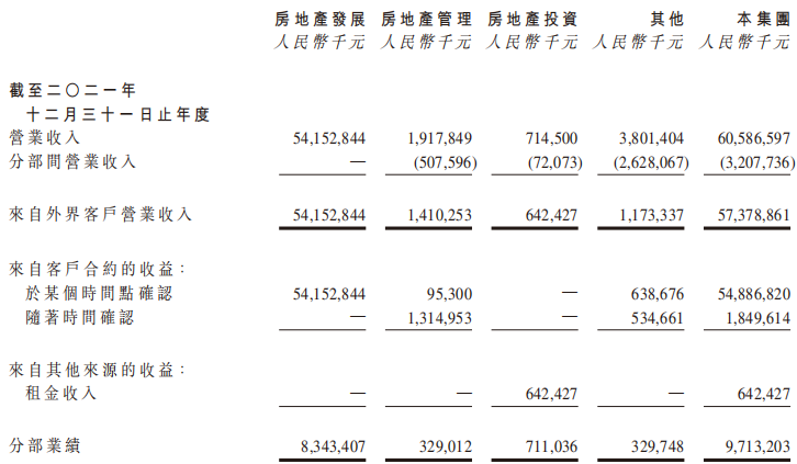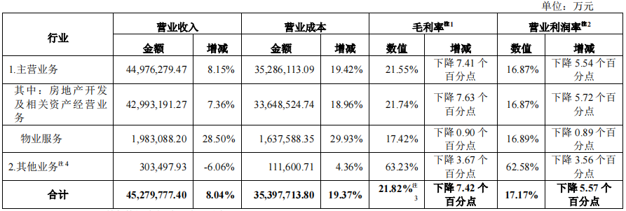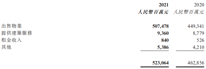 營業收入中,來自房地產開發及相關資產經營業務的營業收入為4,299.3億元;來自物業服務的營業收入為198.3億元。