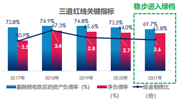 報告期間內,凈負債率為62.8%,現金短債比為2.6,剔除預收賬款的資產負債率為69.7%,達到了三條紅線的要求,步入綠檔陣營。