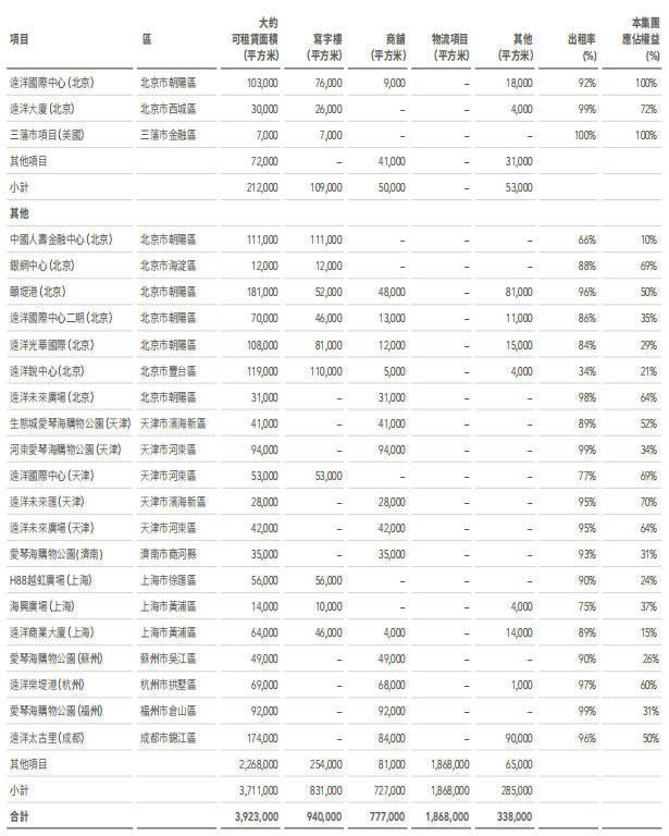 截至2021年年末,遠洋集團合共持有超過23個經營中投資物業。截至2021年末,集團可租賃面積合共3,923,000平方米,其中寫字樓占比約24%,物流項目約為48%,其他包括商業、車位及其他占比約28%。