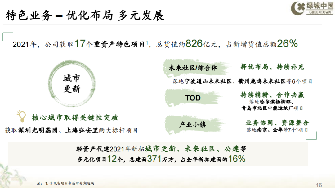 2021年,集團共獲取17個重資產特色特質項目,總貨值約人民幣826億元,占新增貨值總額26%。城市更新業務取得突破進展,獲取了深圳光明荔園和上海弘安里兩個代表性項目;城市綜合體、未來社區業務多點開花,落地寧波通山未來社區、衢州鹿鳴未來社區等6個項目;產業小鎮和TOD項目持續落地。