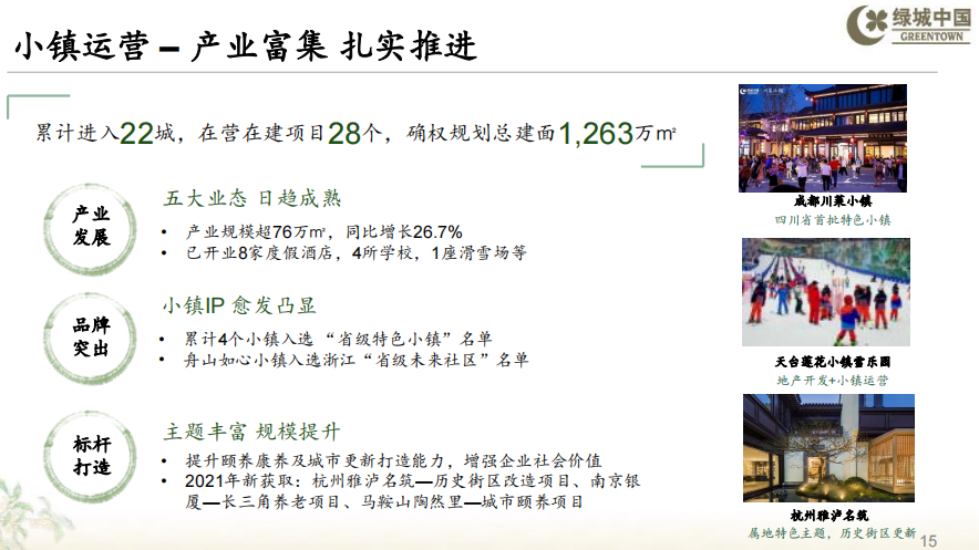 小鎮業務方面,小鎮規模穩步提升,截至2021年底,小鎮業務累計進入22城,在營在建項目28個,確權規劃總建筑面積約1,263萬平方米。小鎮業務通過可售物業和產業經營「雙輪驅動」。