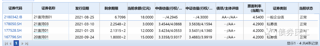 目前,富春灣建投存續(xù)債券金額為48億元,存續(xù)債券4只,存續(xù)債券產(chǎn)品包括企業(yè)債券和私募公司債券。(wind統(tǒng)計(jì)口徑中,債權(quán)融資計(jì)劃未被列為債券品種)
