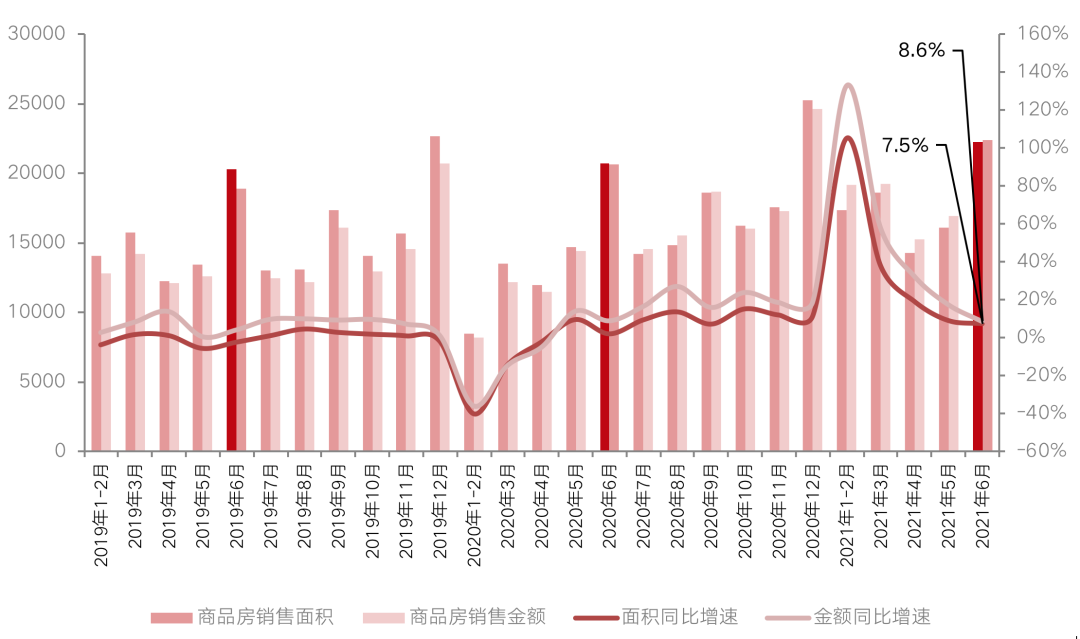 國家統計局數據顯示,1-6月,商品房銷售面積88635萬平方米,同比增長27.7%;比2019年1-6月增長17.0%,兩年平均增長8.1%。其中,住宅銷售面積增長29.4%,辦公樓銷售面積增長10.0%,商業營業用房銷售面積增長5.7%。商品房銷售額92931億元,增長38.9%;比2019年1-6月增長31.4%,兩年平均增長14.7%。其中,住宅銷售額增長41.9%,辦公樓銷售額增長10.7%,商業營業用房銷售額增長8.8%。