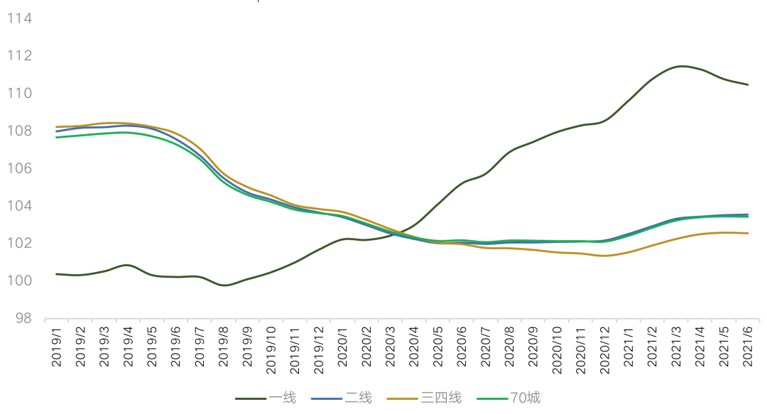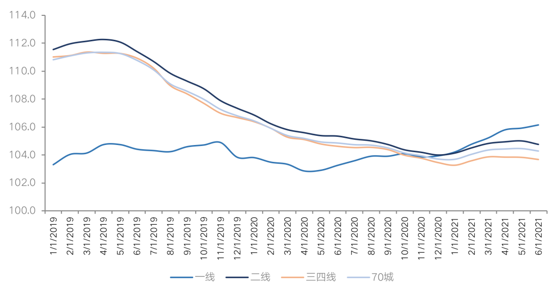 從全國商品房銷售價格來看,2021年6月份,70個大中城市商品住宅銷售價格漲幅整體呈現穩中有落的態勢。