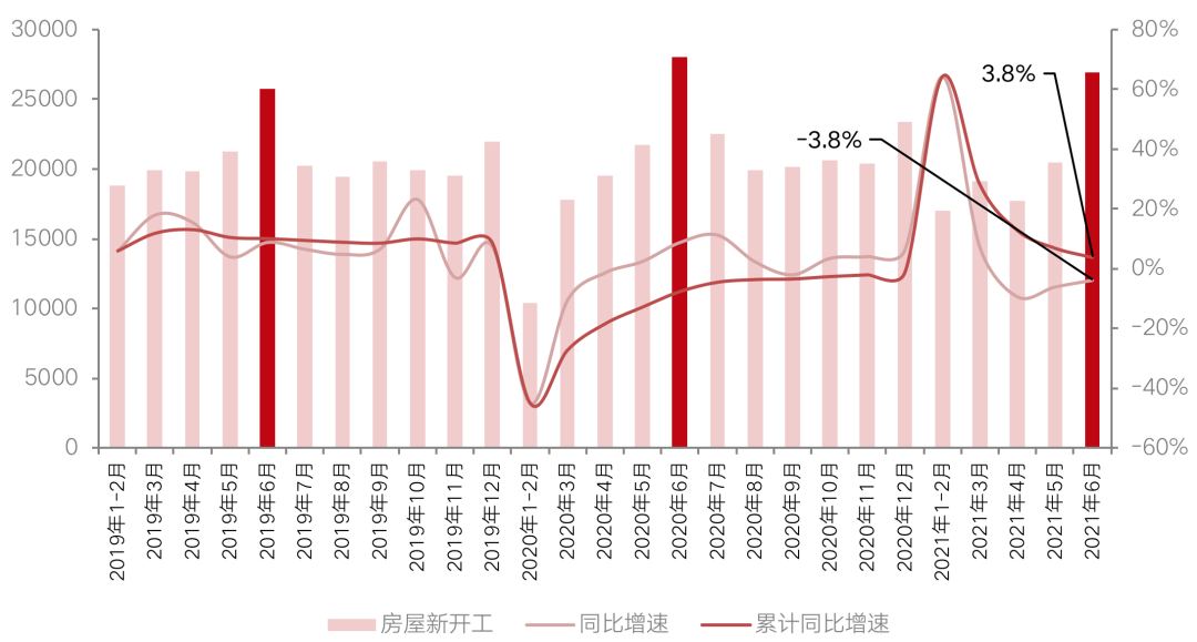 單月來看房屋新開工面積一改上半年頹勢,同比降幅收窄、較2019年回正。6月房屋新開工面積26939萬平方米,雖同比下降3.8%但跌幅收窄2.3pts,且較2019年增長4.7%。規模上本月新開工面積回歸至歷史較高水平,僅次于2020年疫后年中集中開工。過去一年內成交的熱點地塊陸續開工入市下全國新開工規模如預期上升。