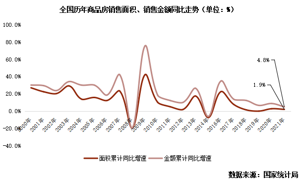 據(jù)國家統(tǒng)計(jì)局?jǐn)?shù)據(jù):2021年,商品房銷售面積17.9億平方米,比上年增長1.9%;商品房銷售額18.2萬億元,增長4.8%。2021年上半年和下半年商品房銷售面積分別同比增28%和降15%。可見上半年較好的市場(chǎng)表現(xiàn)是全年創(chuàng)新高的主要支撐。