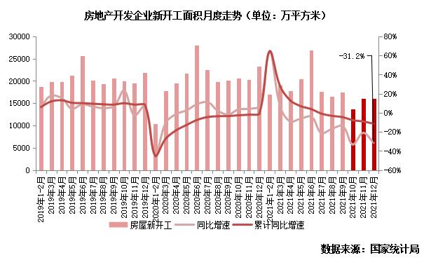 12月全國房屋新開工水平與11月持平,為16075萬平方米。但同比降幅擴(kuò)大至31%,較11月擴(kuò)大了10pcts。傳統(tǒng)的“年底開工潮”不再出現(xiàn),進(jìn)一步表明了民營開發(fā)企業(yè)當(dāng)前仍處于較深困境,銷售回款和融資借款雙雙艱難下,新開工計(jì)劃普遍一再取消拖延。