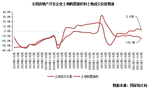 據(jù)國家統(tǒng)計(jì)局?jǐn)?shù)據(jù):2021年,房地產(chǎn)開發(fā)企業(yè)土地購置面積2.2億平方米,比上年下降15.5%;土地成交價(jià)款1.8萬億元,增長2.8%。單月土地購置面積和成交價(jià)款分別為3303萬平方米和3237億元,同比分別下降33%和4%。土地市場(chǎng)已經(jīng)進(jìn)入到了冰點(diǎn)。房地產(chǎn)資金面收到嚴(yán)控下,民營開發(fā)企業(yè)多已無力購置土地,受此影響下土拓投資已難再支撐整體行業(yè)投資規(guī)模。