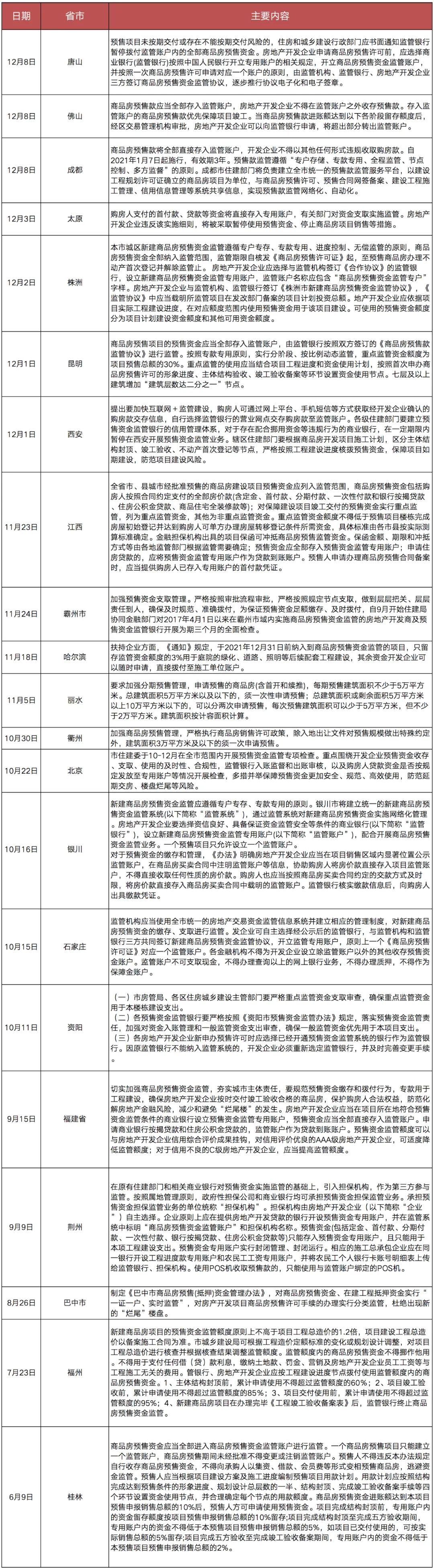 綜合各地政策來看,基本上是著眼于預售資金監管的全流程。比如12月8日成都發布《成都市商品房預售款監管辦法》,要求開發商開設商品房預售資金監管專用賬戶,與監管機構、監管銀行簽訂預售資金監管協議,購房人要將房款直接存入項目監管賬戶。