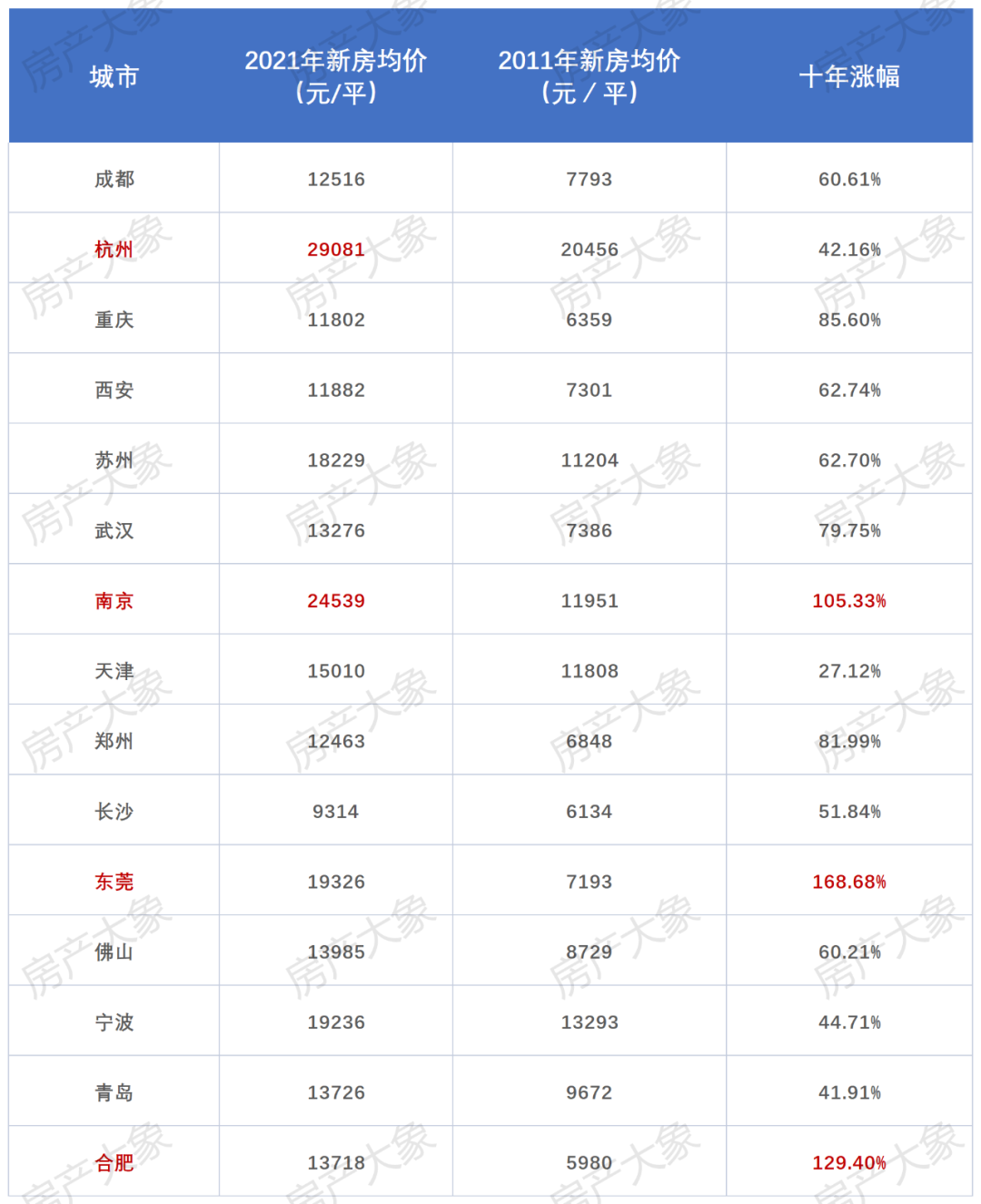 成都、重慶、西安、蘇州、武漢、天津、鄭州、東莞、佛山、寧波、青島、合肥均價都在1萬+/平;