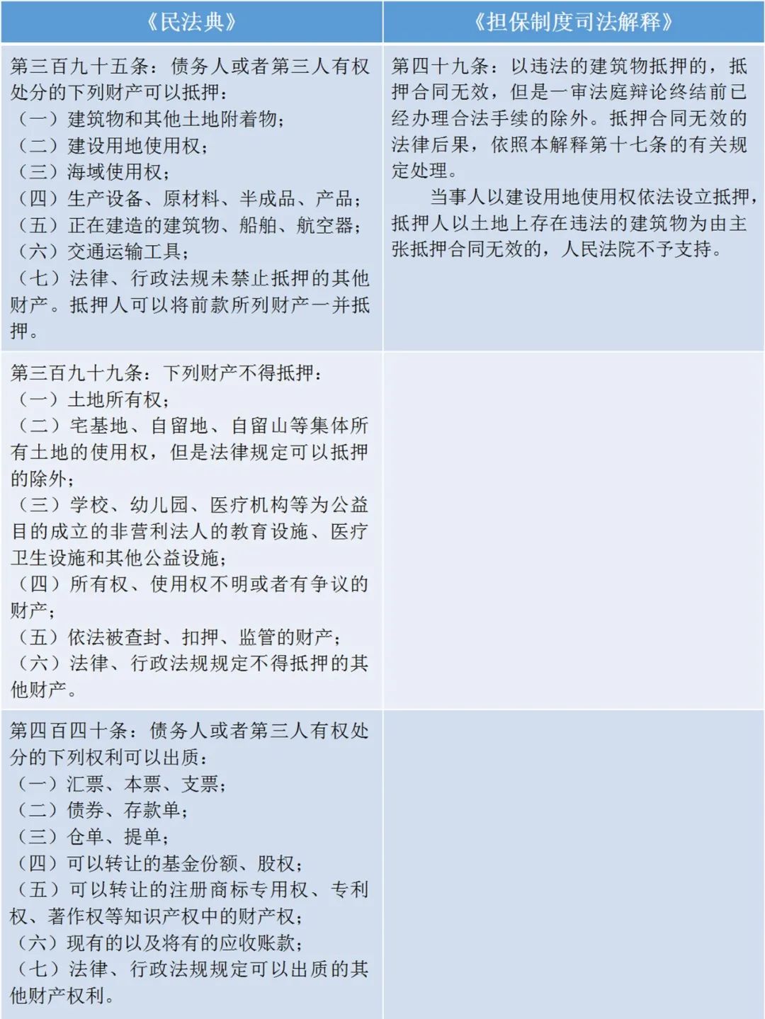 (4)從擔(dān)保物的合法性方面認(rèn)識,《民法典》以列舉的方式,規(guī)定了可以抵押和出質(zhì)的財產(chǎn)種類,以及不得抵押的財產(chǎn)種類,同時也都規(guī)定了兜底性條款。若違反法律規(guī)定以不得設(shè)定擔(dān)保的對象進行抵押的,抵押合同無效,此情形下的擔(dān)保責(zé)任依據(jù)《擔(dān)保制度司法解釋》第十七條進行分配,擔(dān)保人無過錯的,擔(dān)保人不承擔(dān)賠償責(zé)任。其中關(guān)于以違法建筑物設(shè)定抵押的,依據(jù)促進合同履行的原則,只要在一審法庭辯論終結(jié)前已經(jīng)辦理合法手續(xù)的,該抵押合同有效。法條鏈接: