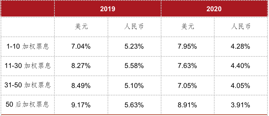 2020年前8月,前十發債集中度提升,人民幣債加權票息下降明顯。與銷售業績集中度提升的方向一致,資金向頭部房企集中以規避中小房企在調控中存在的各類不確定性風險。