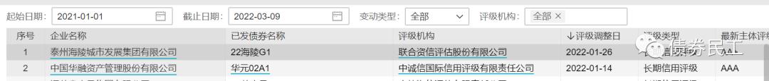 根據(jù)wind資訊的統(tǒng)計(jì)數(shù)據(jù),2022年1月1日至3月9日,國內(nèi)信用債券市場上債券發(fā)行人評級正面變動(dòng)的只有兩例。其中,華融資產(chǎn)為評級負(fù)面調(diào)整為正面,主體信用等級調(diào)升的只有泰州海陵城市發(fā)展集團(tuán)有限公司,主體信用等級由AA調(diào)升至AA+。
