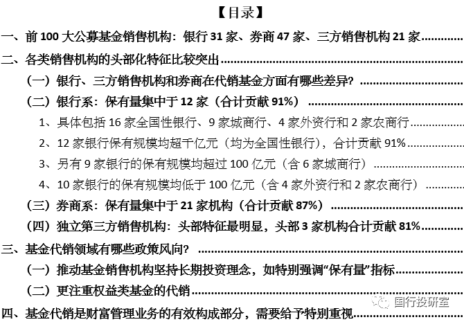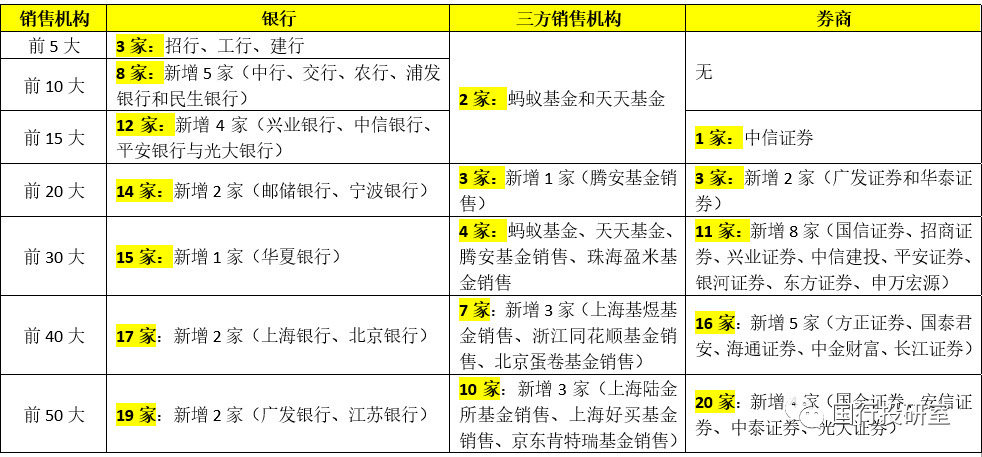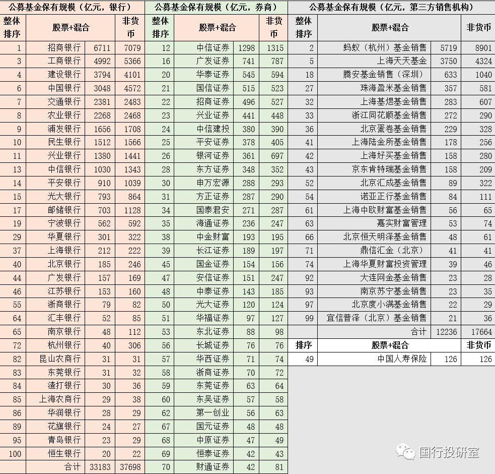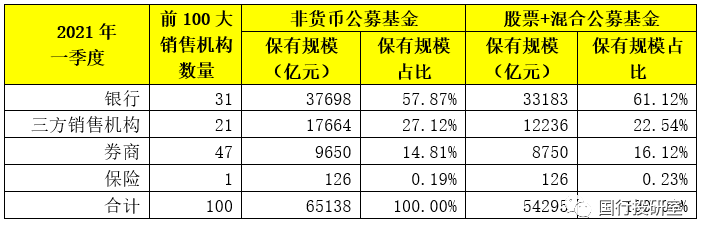 一、前100大公募基金銷售機(jī)構(gòu):銀行31家、券商47家、三方銷售機(jī)構(gòu)21家