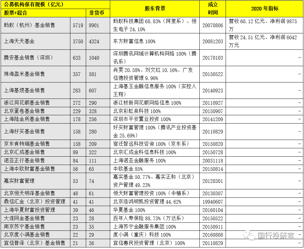 1、目前21家三方銷售機(jī)構(gòu)中,有3家機(jī)構(gòu)的非貨幣公募基金保有規(guī)模超過(guò)1000億元,合計(jì)達(dá)到14265億元、占全部21家機(jī)構(gòu)的81%。這3家機(jī)構(gòu)從高到低依次為螞蟻(杭州)基金銷售(8901億元)、上海天天基金(4324億元)和騰安基金銷售(1040億元)。即3家機(jī)構(gòu)分別為阿里系、東方財(cái)富系和騰訊系。