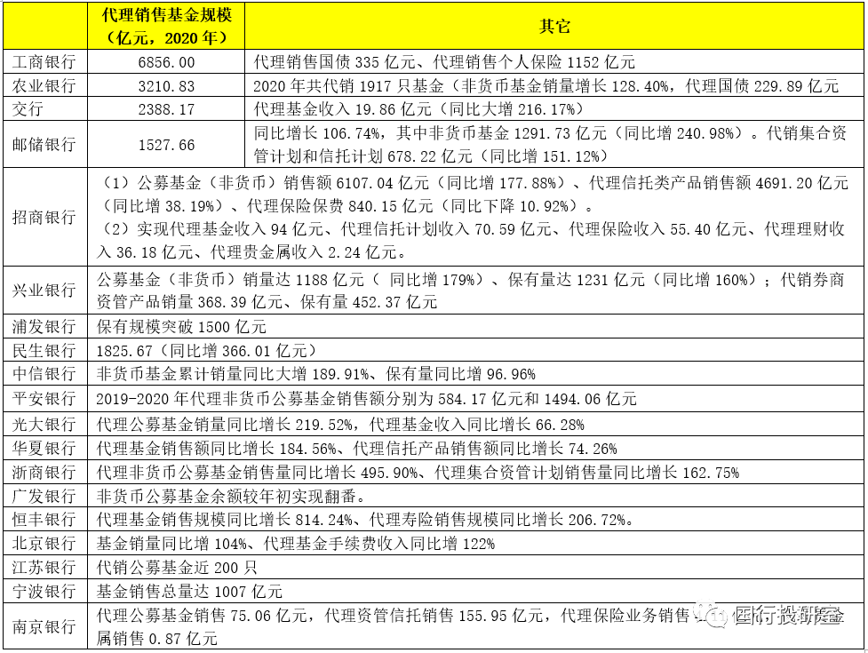 基金代銷、自營(yíng)理財(cái)以及代銷資管計(jì)劃、信托計(jì)劃、保險(xiǎn)等均是財(cái)富管理業(yè)務(wù)的有效組成部分,而基金代銷尤為受到重視,這主要和近兩年公募基金規(guī)模大幅增長(zhǎng)有關(guān)(如截至2021年5月20日,非貨幣公募基金的規(guī)模已增至12.84萬(wàn)億,2018-2020年底分別為4.76萬(wàn)億、7.29萬(wàn)億和12.01萬(wàn)億)。同時(shí)基金代銷業(yè)務(wù)亦相當(dāng)于銀行的個(gè)人客戶提供了投資權(quán)益類資產(chǎn)、涉足資本市場(chǎng)的有效渠道。