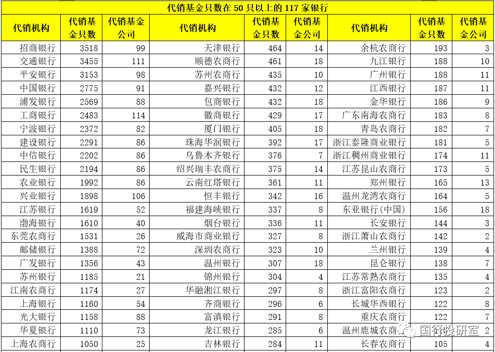 北京銀行、杭州銀行、微眾銀行、泉州銀行、東莞銀行、青島銀行、晉商銀行、南京銀行、北京農(nóng)商行、中原銀行、大連銀行、浙商銀行、西安銀行、天府銀行、河北銀行與哈爾濱銀行等16家銀行的代銷基金只數(shù)均超過(guò)500只。