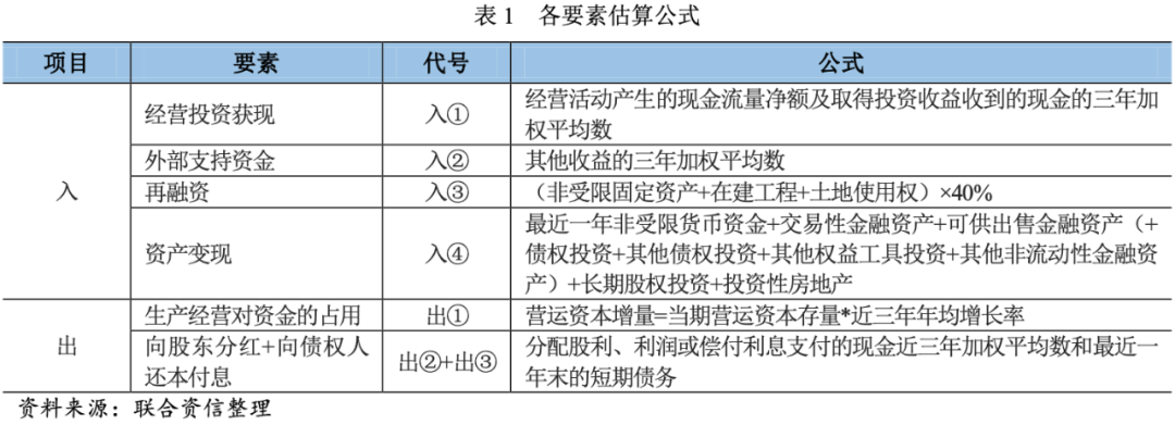 ①經營投資獲現,以現金流概念為基礎,聯合資信選取經營活動產生的現金流量凈額及取得投資收益收到的現金的三年加權平均數來預測下一年度企業經營投資獲現;