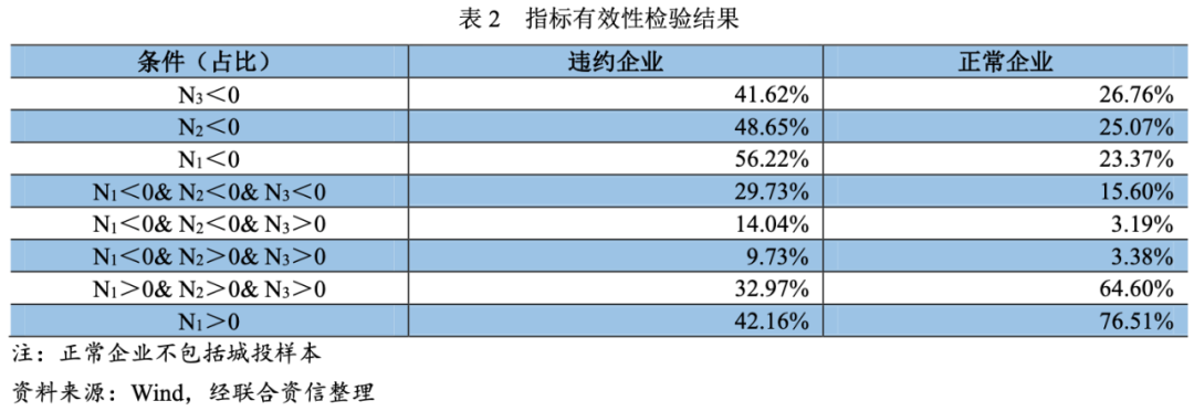 上表數據顯示,①近六成的違約企業違約前一年的指標值為負,同時,76.51%的非城投正常企業最近一年的指標值為正,說明指標在違約企業和正常企業(非城投企業)間有一定的區分度。如果企業指標值為負,則應針對企業個體情況提高指標精確度,進一步核查其到期債務償還能力。②在違約時點的預測上,在違約前一年指標為負的樣本中,42.31%(占全部樣本的23.77%)的違約企業指標在違約前兩年出現了由正轉負的情況,即一旦指標由正轉負,企業可能將在1~2年內違約。