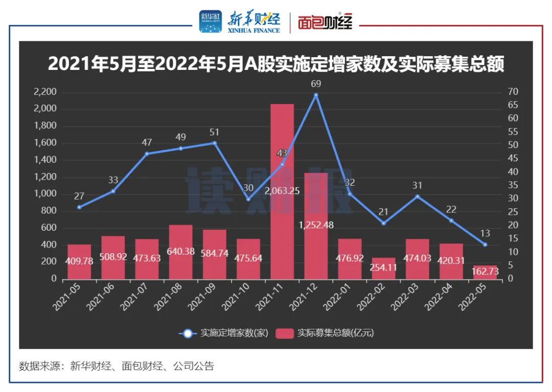 統計顯示,2022年5月,A股上市公司共計實施定增13起,實際募資總額約162.73億元,定增實施家數及實際募集資金較上月均有明顯下降,較上年同期相比也有較大差距。