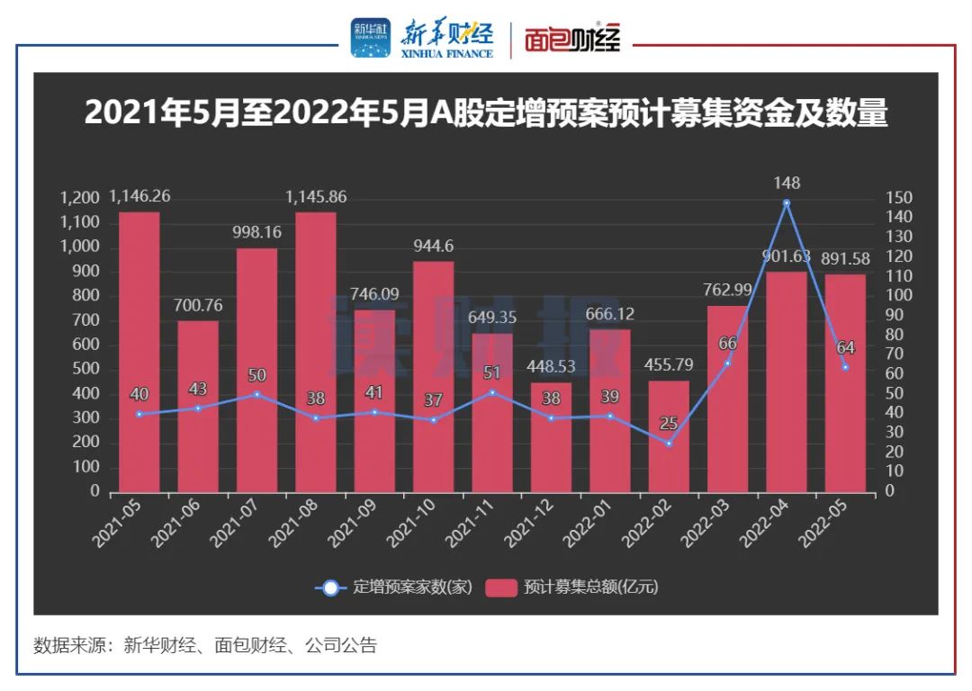 以首次披露預案公告日統計,2022年5月A股上市公司披露的定增預案(同一定增預案下的募資及配套募資合并統計,下同)共計64起,環比下降84起;預計募資規模合計約891.58億元,與上月相比微降1.11%。
