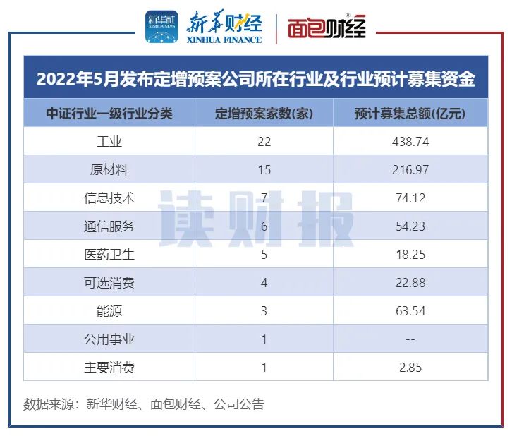 從行業分布來看,以中證行業統計,2022年5月,工業有22家公司發布定增預案,數量排在各行業之首;原材料行業排在第二位,有15家公司發布定增預案;信息技術行業有7家發布定增預案,位列第三位。