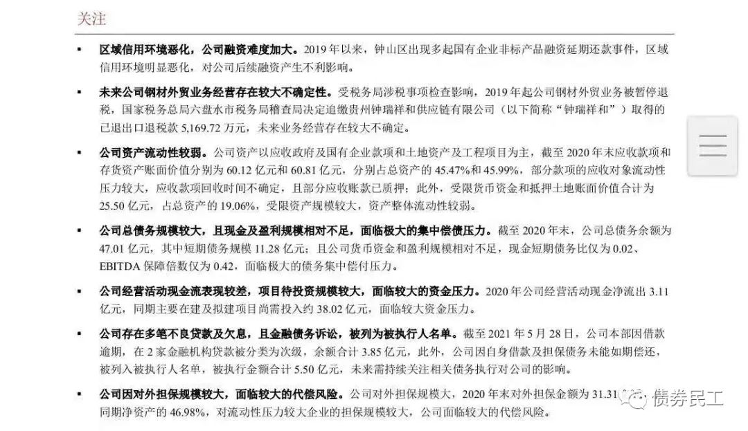 本次評級下調的原因可能是攀登開投的區(qū)域信用環(huán)境惡化、鋼材貿易業(yè)務存在較大不確定性、資產流動性弱、債務規(guī)模大、存在多筆不良貸款及欠息。其中最得值關注的一點是區(qū)域信用環(huán)境惡化,鐘山區(qū)出現(xiàn)多起國有企業(yè)非標產品融資還款事件。