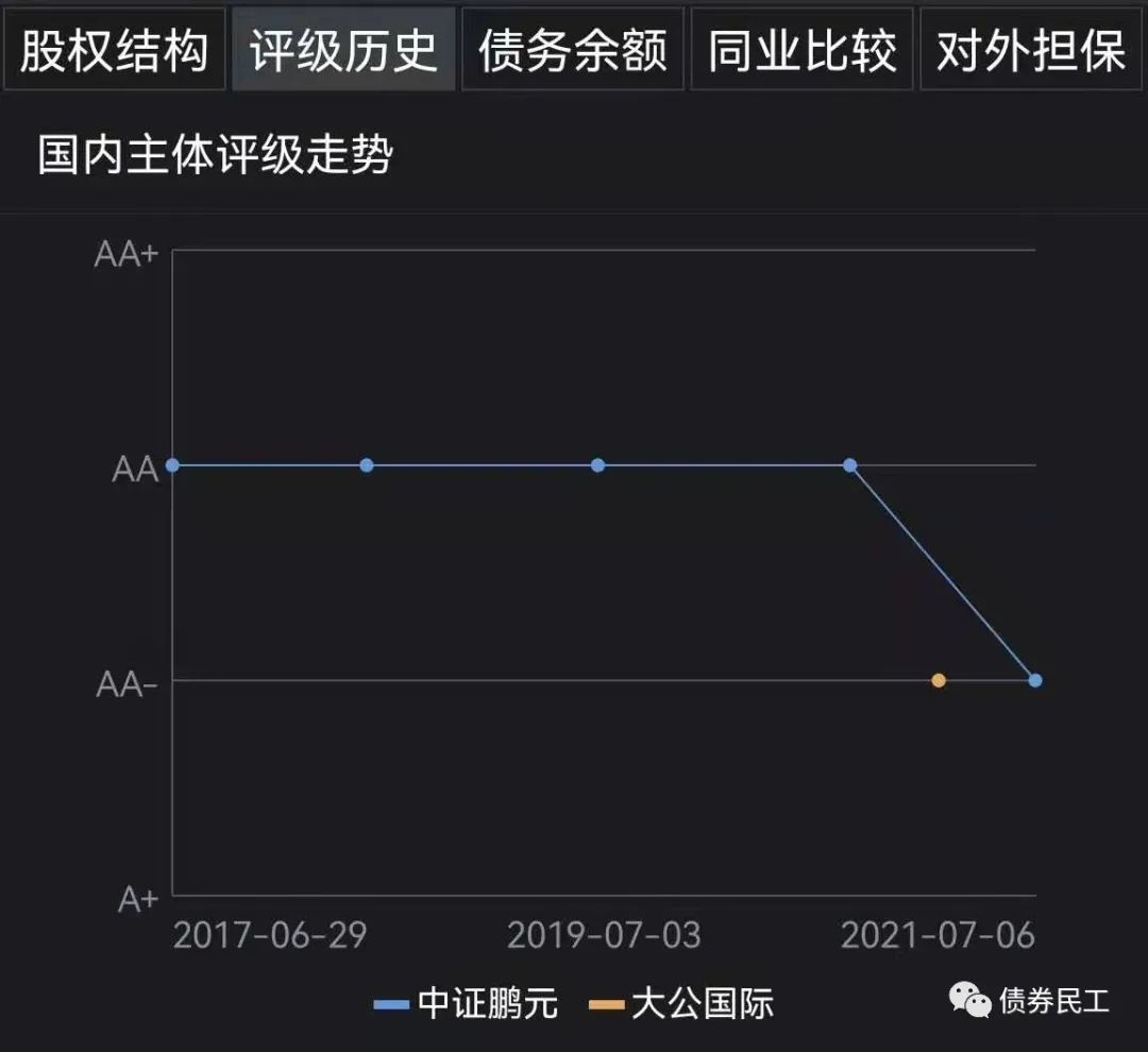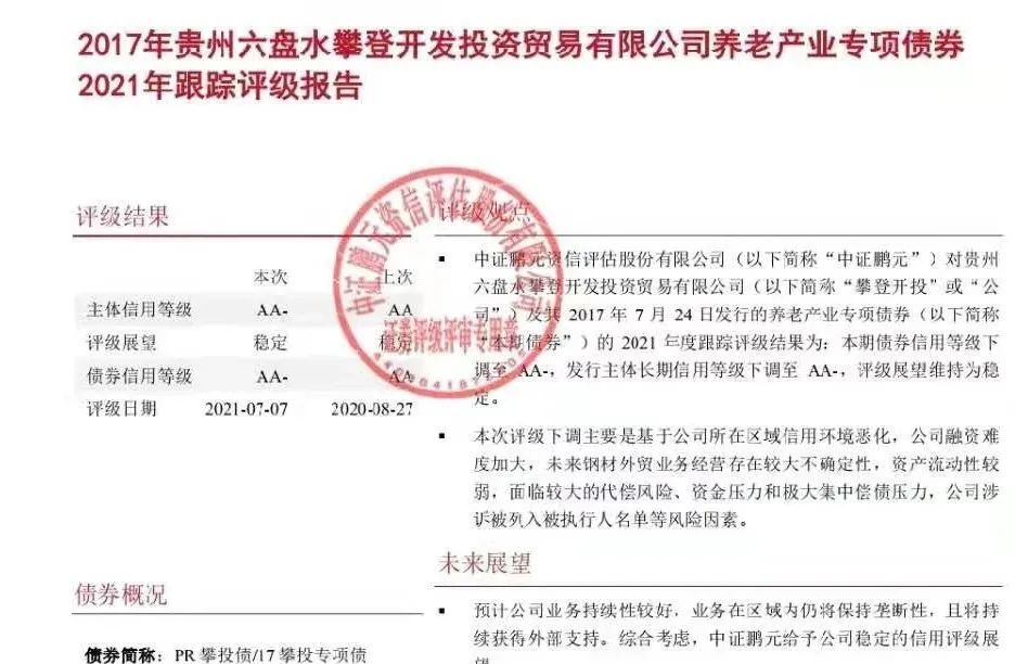 630跟蹤評級報告的關鍵期過去了,但是部分城投公司主體評級下調還在繼續(xù)。根據中證鵬元出具2021年7月7日出具的跟蹤評級報告,貴州六盤水攀登開發(fā)投資貿易有限公司(以下簡稱“攀登開投”)的主體評級由AA下調至AA-。