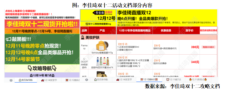 隨著這些文檔的快速傳播,機構也開始關注起這一風潮,一些研究機構將自己收錄的信息通過在線文檔的形式傳播。而簡潔清楚的Excel更是幫助消費者應對越來越復雜的雙十一規則的利器。因此消費品行業也是掀起了一股“EXCEL營銷”風潮,成為一股新興的營銷勢力。例如李佳琦團隊雙十一和雙十二活動期間均有自己制作的官方文檔活動推出,里面詳細收錄了活動時間、參與方式、到手價格等一系列信息,消費者一目了然就能夠獲取商品所有的信息和優惠的詳細內容,只需照單購買。