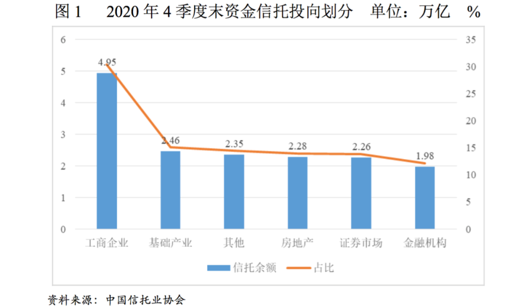 事實上,房地產、城投企業一直是違約信托產品最為集中的領域。根據用益信托網的最新統計,2021年一季度發生的65起信托違約事件中,房地產領域達到20起,基礎產業(一般來自于城投企業)達到18起,是違約數量居于前兩位的行業。在信用融資監管趨嚴的大背景下,疊加此次融資類信托的收緊,城投、房地產行業尤其是業內中小企業受到的沖擊值得關注。