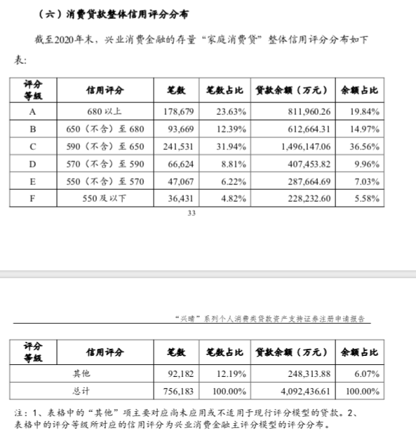 報告中還披露了興業消費金融消費貸款整體信用評分分布情況。興業消費金融目前使用的內部評分,主要以客戶是否逾期作為因變量,客戶畫像特征作為自變量,運用邏輯回歸技術擬合和預測新客戶的違約可能性,總分區間在400- 700之間,評分越高,違約概率相對越低。