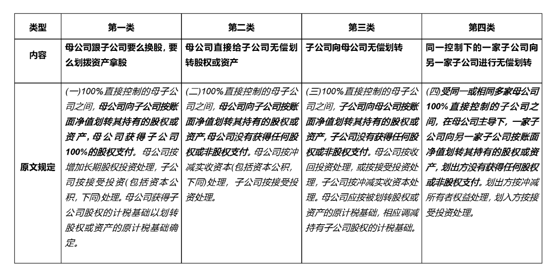 “一、《通知》第三條所稱“100%直接控制的居民企業之間,以及受同一或相同多家居民企業100%直接控制的居民企業之間按賬面凈值劃轉股權或資產”,限于以下情形:”
