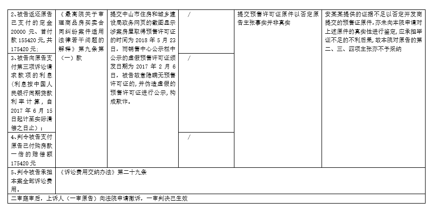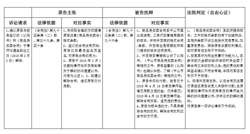 案情背景:原告安某向被告開發(fā)商認購一套商品房,分別于2017年6月8日、6月15日簽訂《認購書》、《中山市商品房買賣合同》,約定開發(fā)商將位于中山市西區(qū)某幢1001房(以下簡稱案涉商品房)出售給原告,原告于2017年6月8日、6月15日分別向被告交付定金20000元、首付款155420元,共176150元至指定被告賬戶。2018年3月1日,原告委托律師向被告發(fā)出律師溝通函,要求解除雙方簽訂的認購書及商品房買賣合同,要求開發(fā)商退還定金和購房款。被告不同意,業(yè)主遂向法院起訴。原告對自己提出的訴訟請求所依據(jù)的事實,以及被告反駁原告訴訟請求所依據(jù)的事實,以及法官根據(jù)法律規(guī)范(法律法規(guī)及相關(guān)司法解釋)及證據(jù)規(guī)則,在自由心證的基礎(chǔ)上認定如下表: