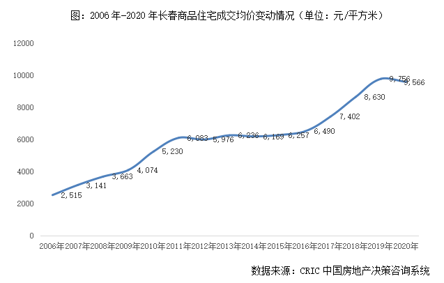 房價層面,長春商品住宅成交均價如大連一樣,也呈現出“階梯性”爬升特點:2017-2010年逐年遞增至房價破5000元/平方米,2011-2016年高位持穩在6000元/平方米,并無太大波動,2017年開始進入新一輪爬升,2019年再度達到階段性高點,商品住宅成交均價高位維持在9756元/平方米,2020年小幅微降至9566元/平方米,至今房價尚未破萬。