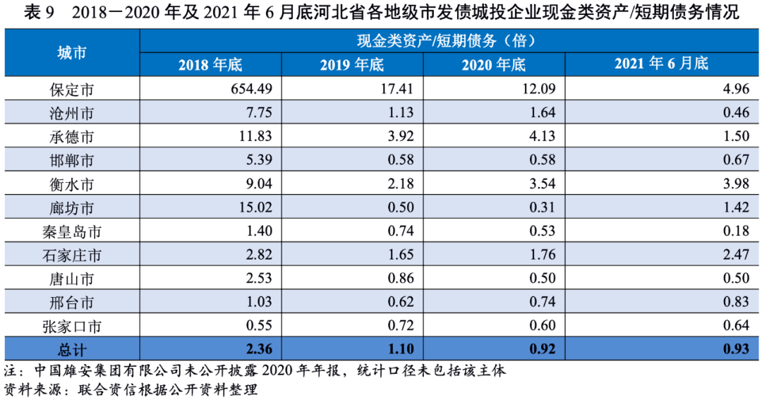2020年,河北省發債城投企業債務負擔進一步加重,其中張家口市、邢臺市、保定市和承德市的發債城投企業債務負擔較重,唐山市的發債城投企業未來三年到期債券規模較大,秦皇島市、滄州市、唐山市的短期償債壓力相對較大。