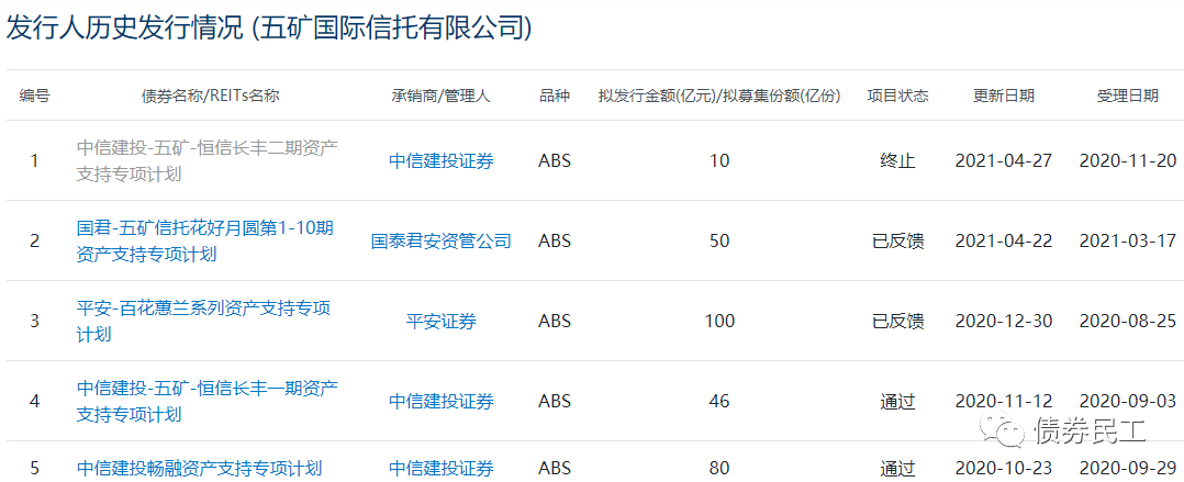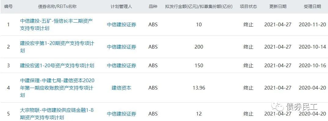 就在一周前,上海證券交易所于2021年4月20日終止了5只ABS產品的審核,合計擬發(fā)行金額為162.24億元。