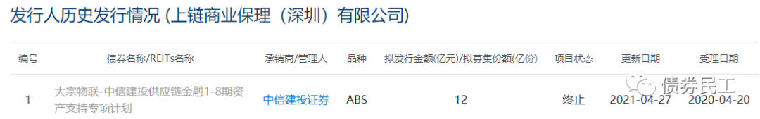 5、大宗物聯(lián)-中信建投供應鏈金融1-8期資產支持專項計劃擬發(fā)行規(guī)模為12億元,發(fā)行人為上鏈商業(yè)保理(深圳)有限公司,此前未申報過ABS產品。