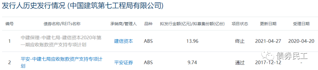 4、中建保理-中建七局-建信資本2020年第一期應收賬款資產支持專項計劃擬發(fā)行規(guī)模為13.96億元,發(fā)行人為中國建筑第七工程局有限公司,此前申報過一單ABS產品:2017年申報的總額為9.74億元的產品通過。