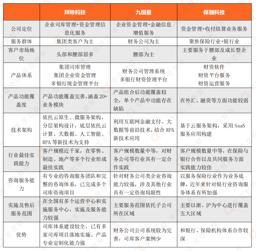 III類則主要為深耕于資金管理、司庫管理市場的技術性垂直服務商,這一類服務商由于長期專注于企業集團的資金管理系統,在數字化賦能、維護資金的穩健運行層面有著更透徹的服務能力,相較于綜合型企業服務商雖然在規模上有一定的差距,但是其差異化優勢明顯,在當前司庫管理建設領域有著更為獨到的心得,這類服務廠商代表包括拜特科技、九恒星、保融科技等。